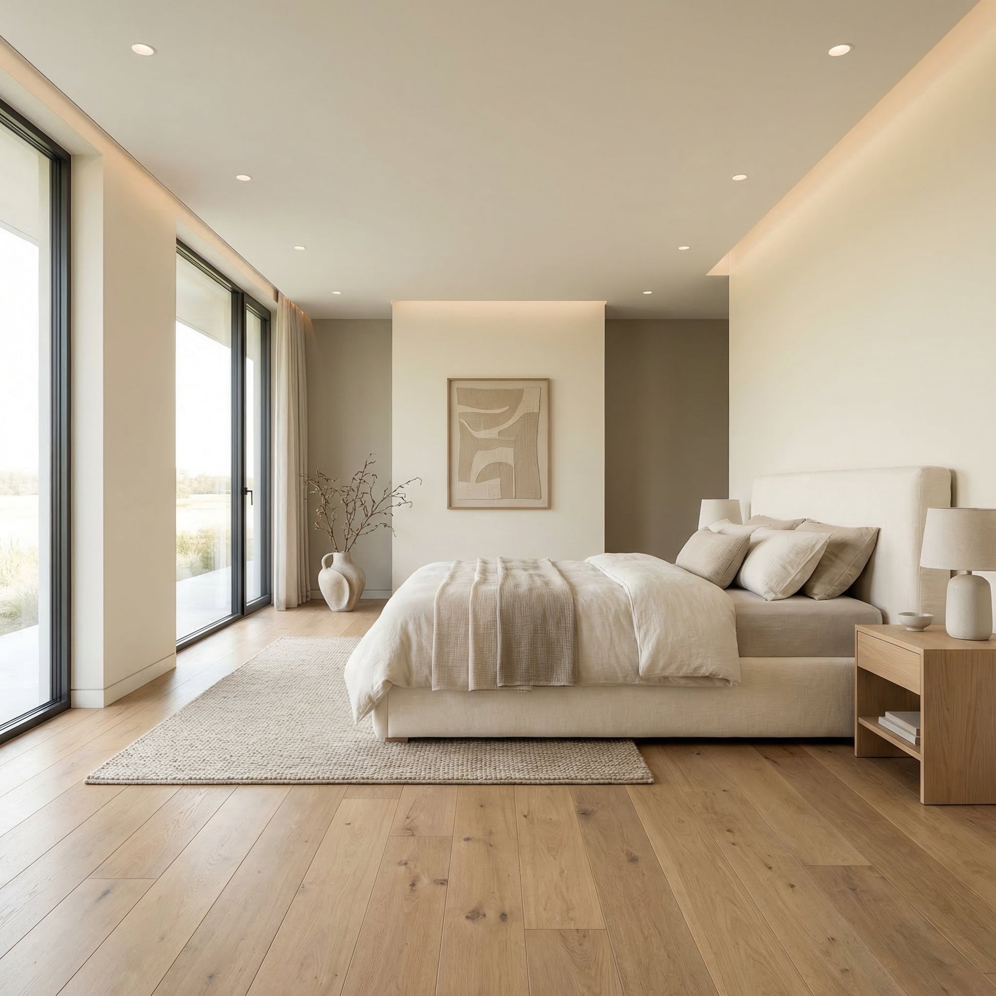 This bedroom embraces a light and airy aesthetic with a palette built around soft creams and warm beige tones. Natural light enhances the textures of upholstered furniture and subtle decorative elements, creating a peaceful and welcoming environment. The design focuses on comfort and simplicity while maintaining a refined, modern appearance.