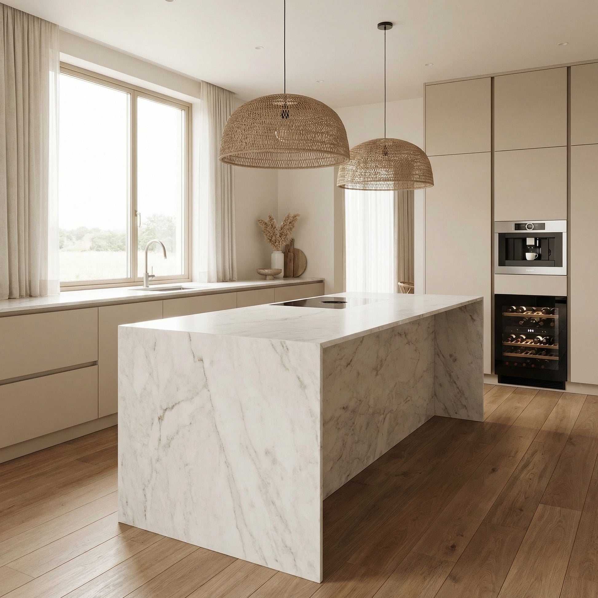 This kitchen was designed to balance aesthetics and practicality. Custom cabinetry in warm beige tones creates a soft and elegant atmosphere, while a natural stone island becomes the central feature of the space.