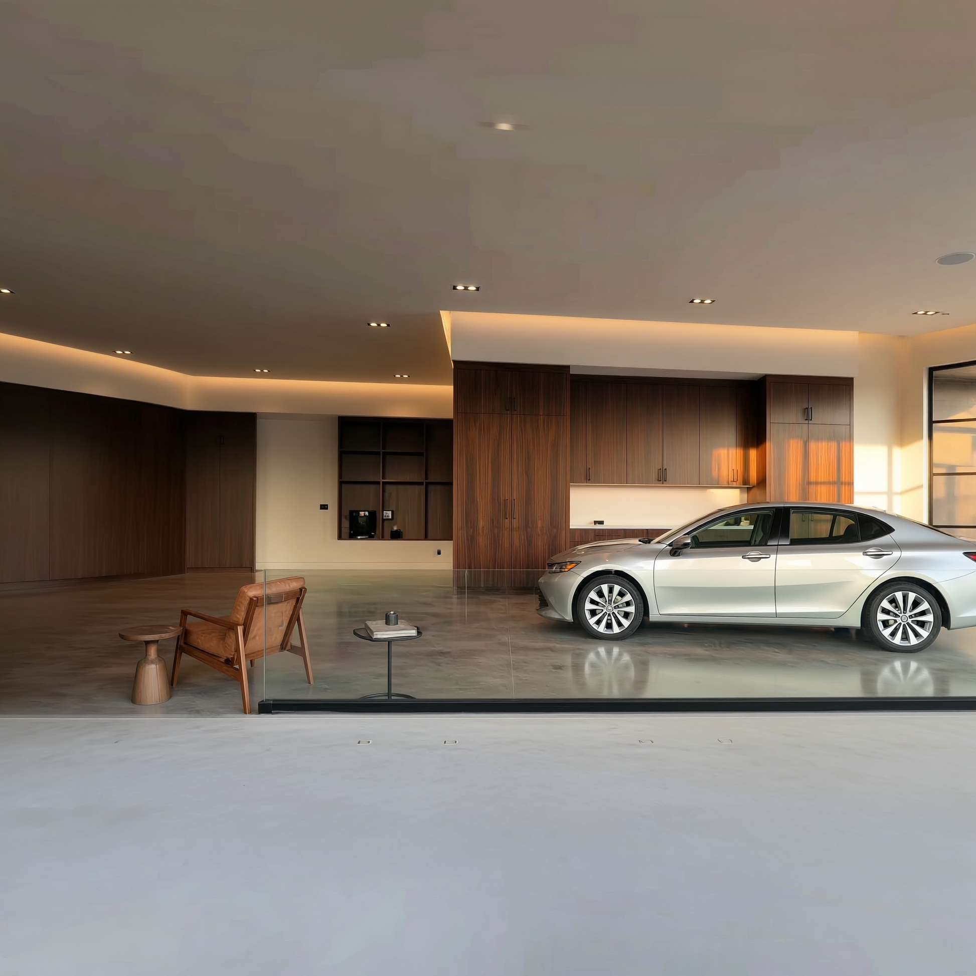 Large windows allow natural daylight to enter the space, creating a bright and functional environment. The design balances practicality with modern aesthetics, transforming the garage into a refined extension of the home rather than simply a storage area.
