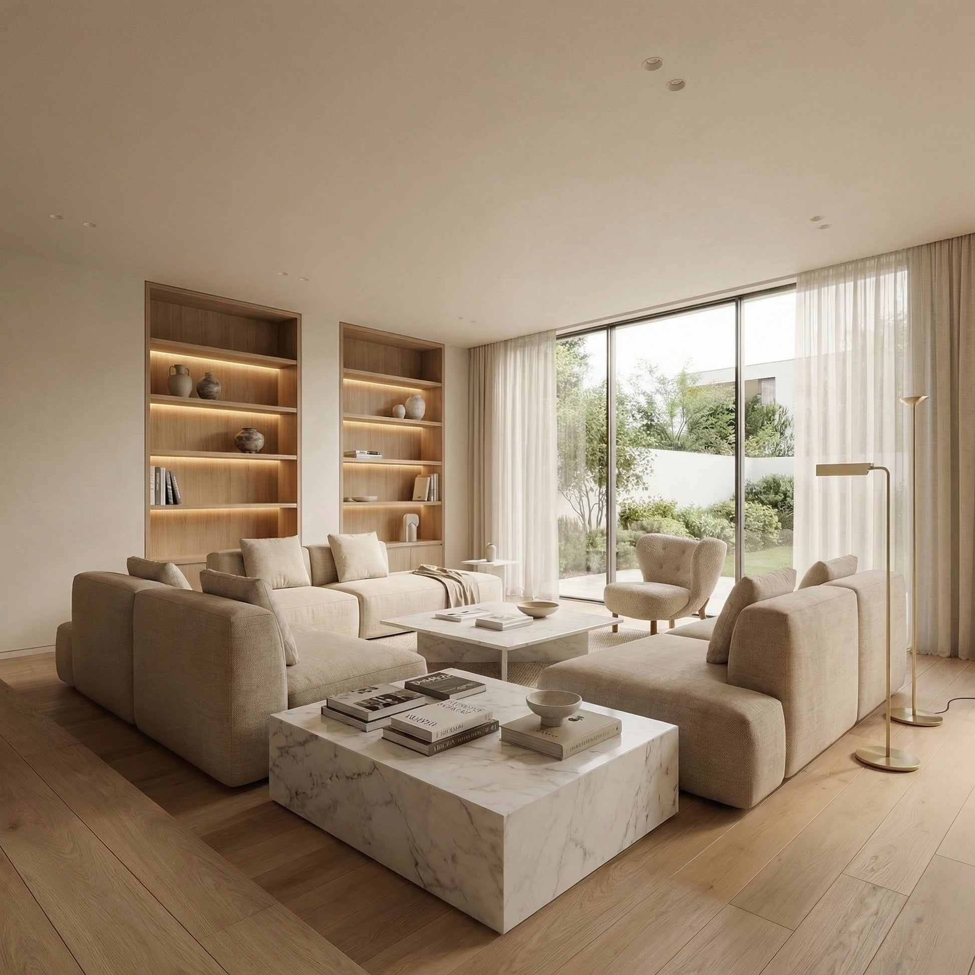 A large modular sofa anchors the room, while custom shelving and subtle lighting create visual depth. Floor-to-ceiling windows allow natural light to highlight the soft palette and architectural details.